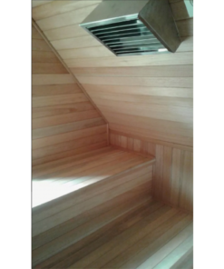 Sauna de madera de eucalipto seleccionado de primera calidad , estacionado sin nudos . Puerta dede madera maciza seleccionada. La misma cuenta con doble cristal de seguridad, bisagras de bronce, picaporte vaivén a rodillo y manija de madera tallada. Es completamente reforzada que evita que con el tiempo se desajuste por el calor y el movimiento. Una grada de asiento piso de deck.